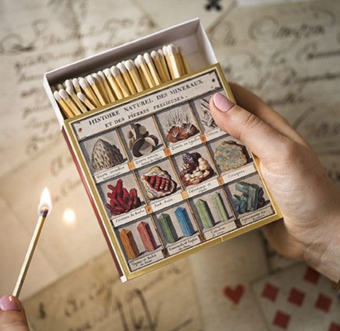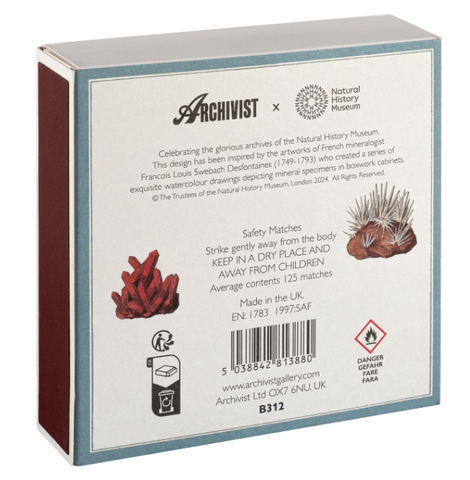 Our signature square matchbox featuring illustrations of twelve minerals in neutral, earthy tones.