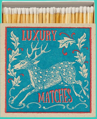 Our signature square matchbox featuring a wintery scene with a stag in the centre, along with the words 'Luxury Matches'